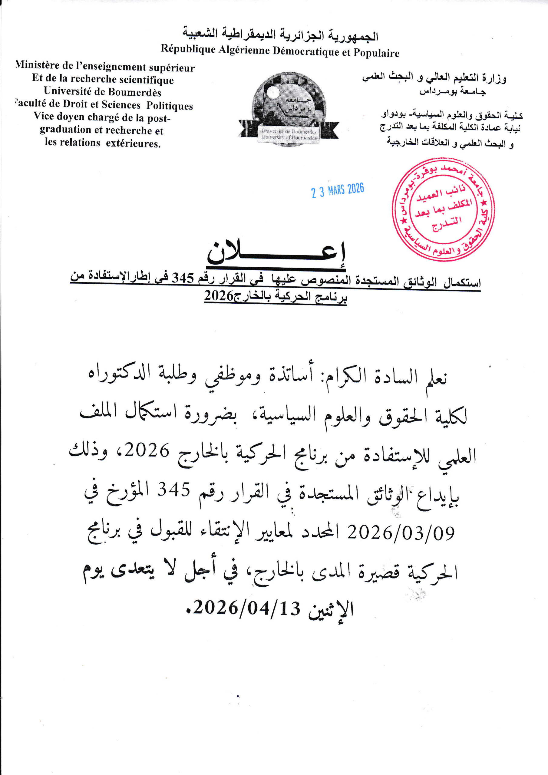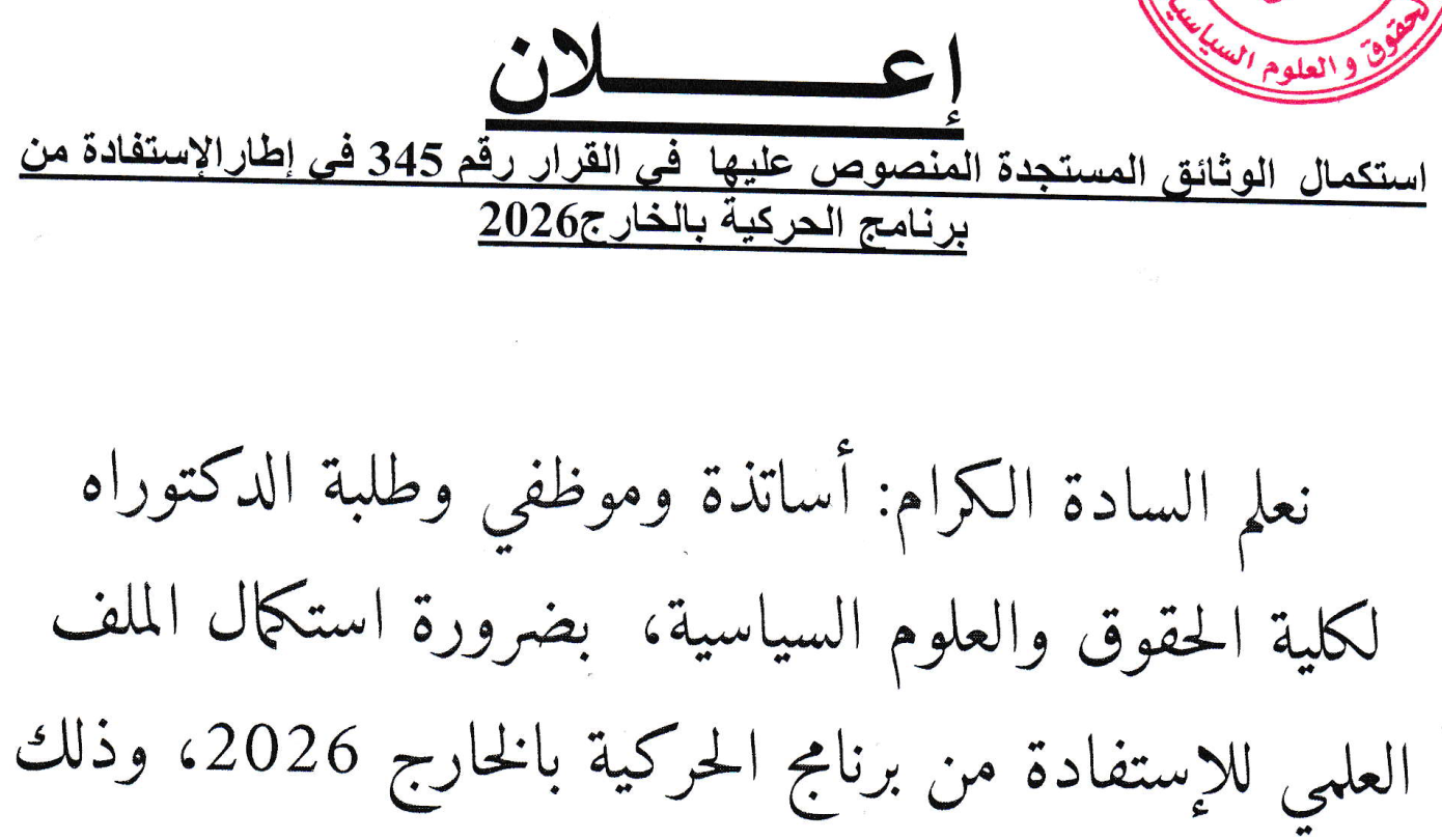 نعلم سيادتكم أنه يمكنكم ايداع ملفات التظاهرات العلمية الدولية، التي تتوفر على الشروط العلمية والتنظيمية التي تضمنتها النصوص الصادرة عن الوزارة الوصية في هذا الشأن، وأهمها: 1- ان تكون ضمن المواضيع ذات الأولوية، لاسيما المتعلقة بالأمن الغذائي، الصحي والطاقوي. 2- إعطاء الصبغة الدولية للتظاهرة …