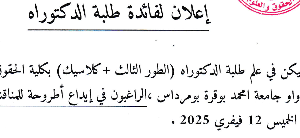 إعلان عن مناقشة أطروحة الدكتوراه للطالب بن حدة يعقوب