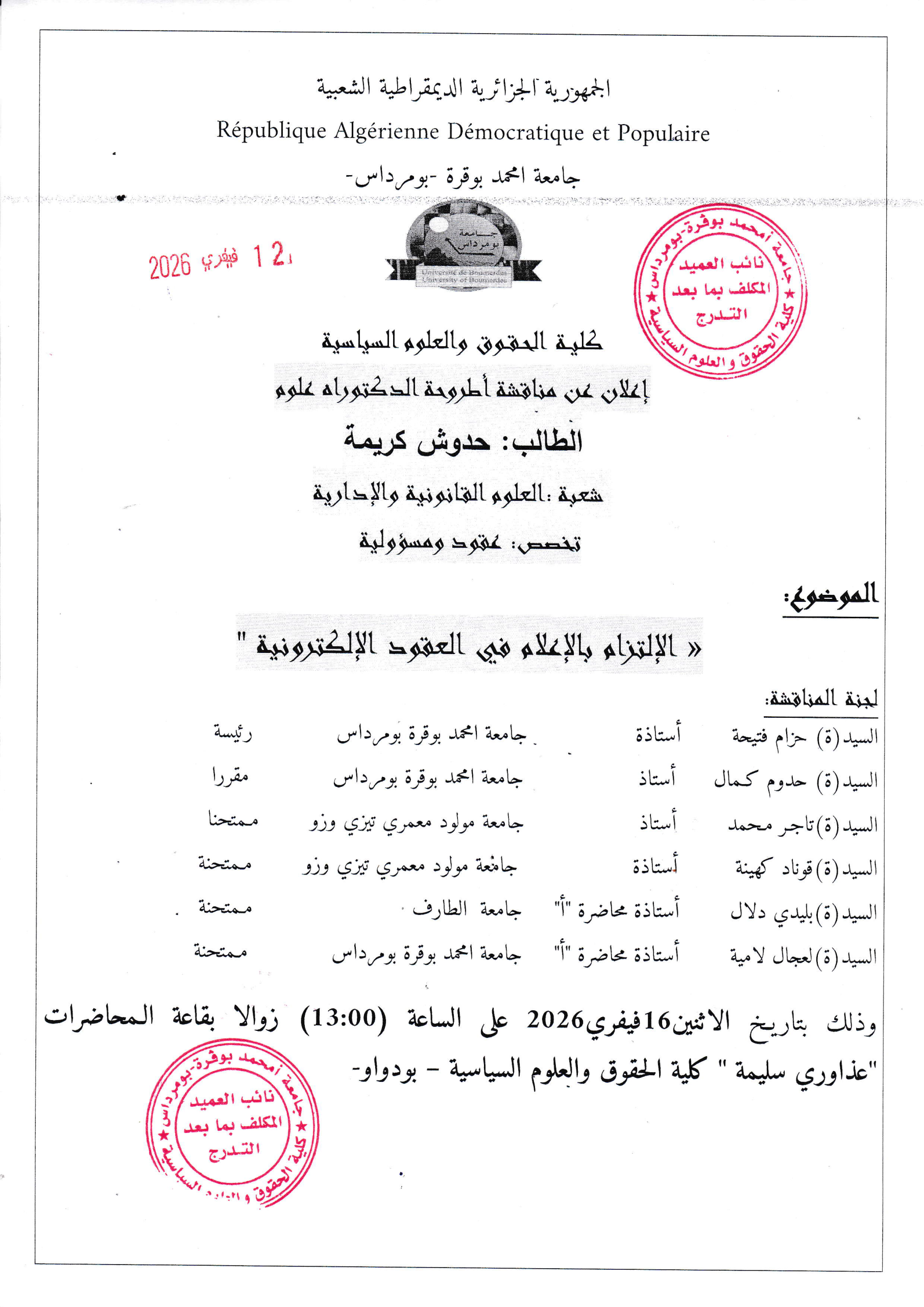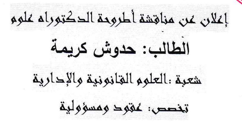 إعلان عن مناقشة اطروحة الدكتوراه للطالبة بن جدو اسماء