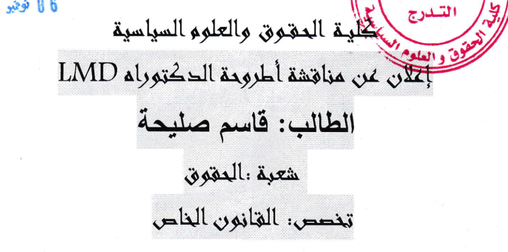 إعلان عن مناقشة أطروحة الدكتوراه للطالب بن حدة يعقوب
