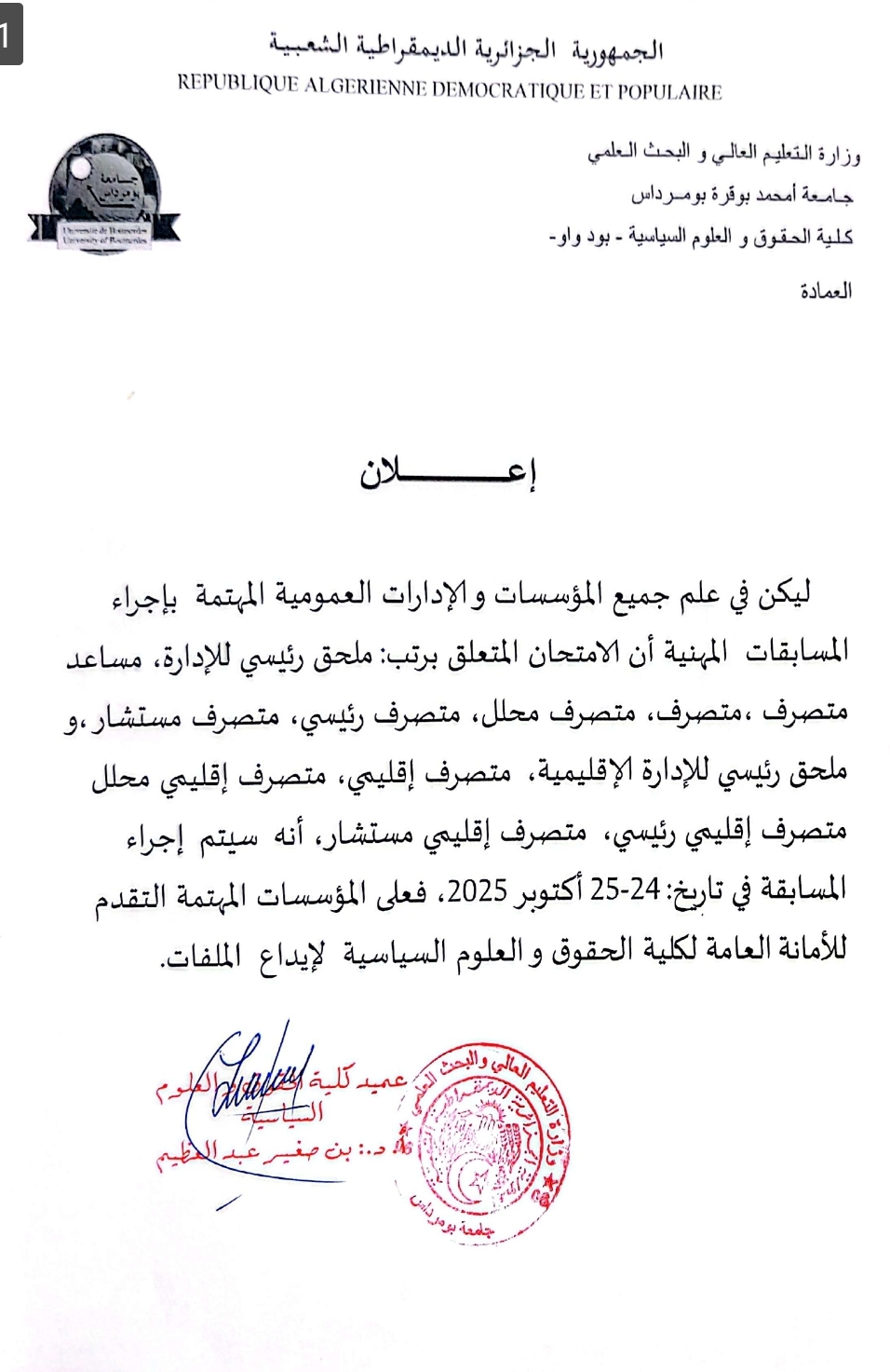 إعلان بخصوص إجراء مسابقة مهنية يوم 24-25 أكتوبر 2025