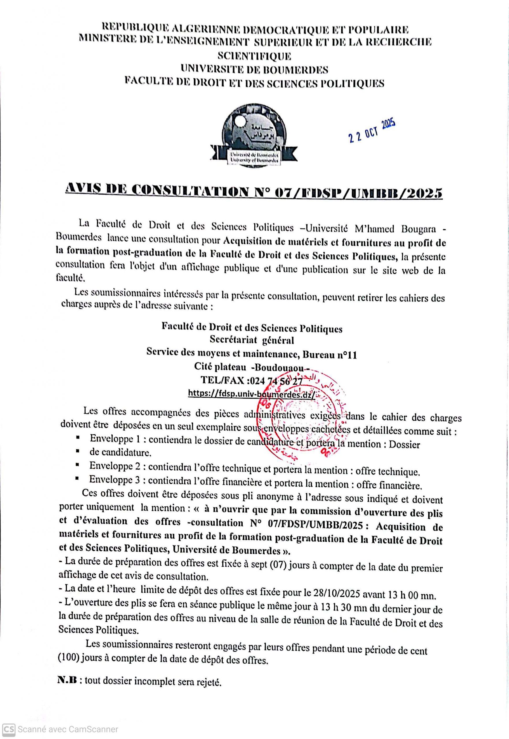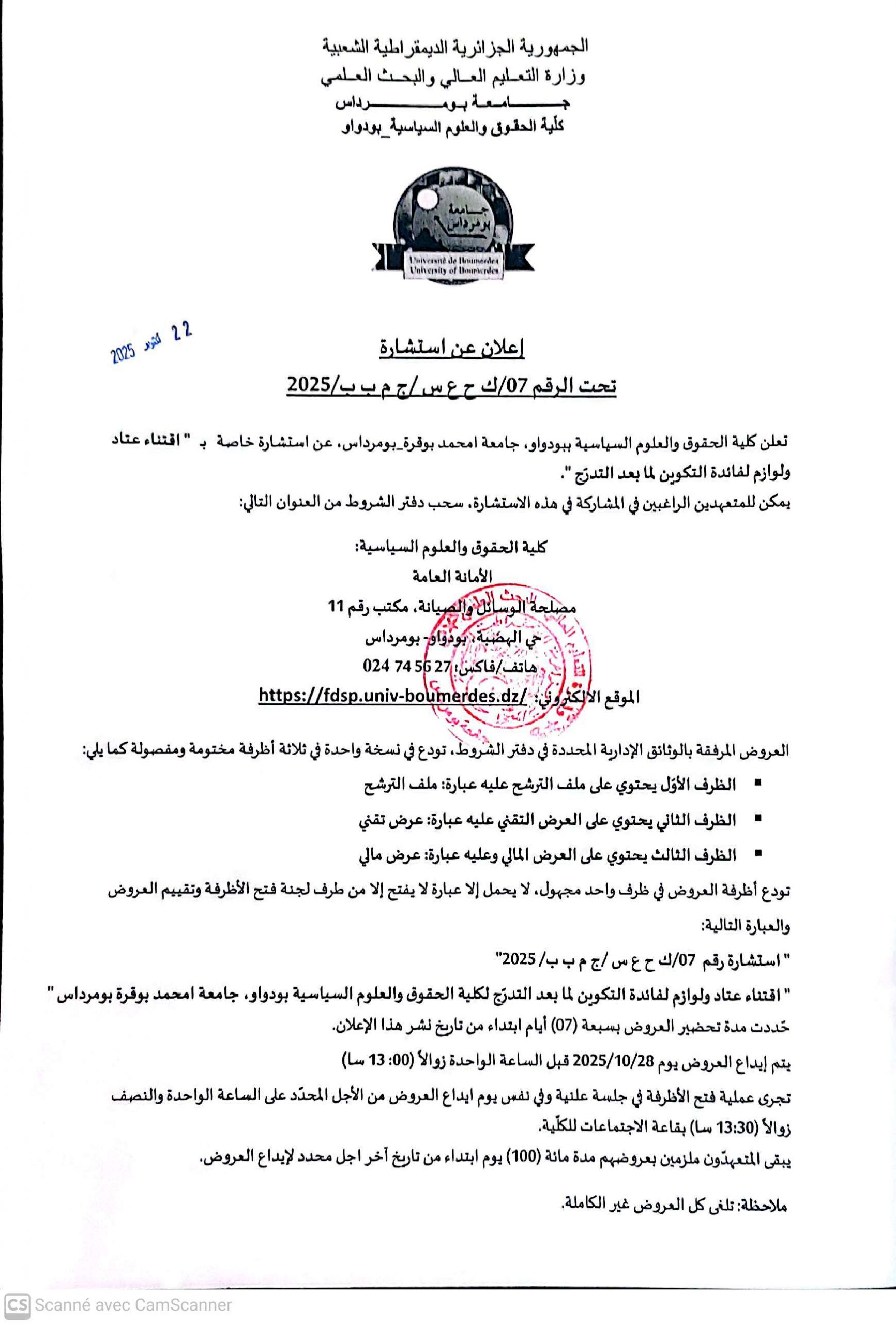 إعلان عن استشارة خاصة بـ »اقتناء عتاد ولوازم لفائدة التكوين لما بعد التدرج »