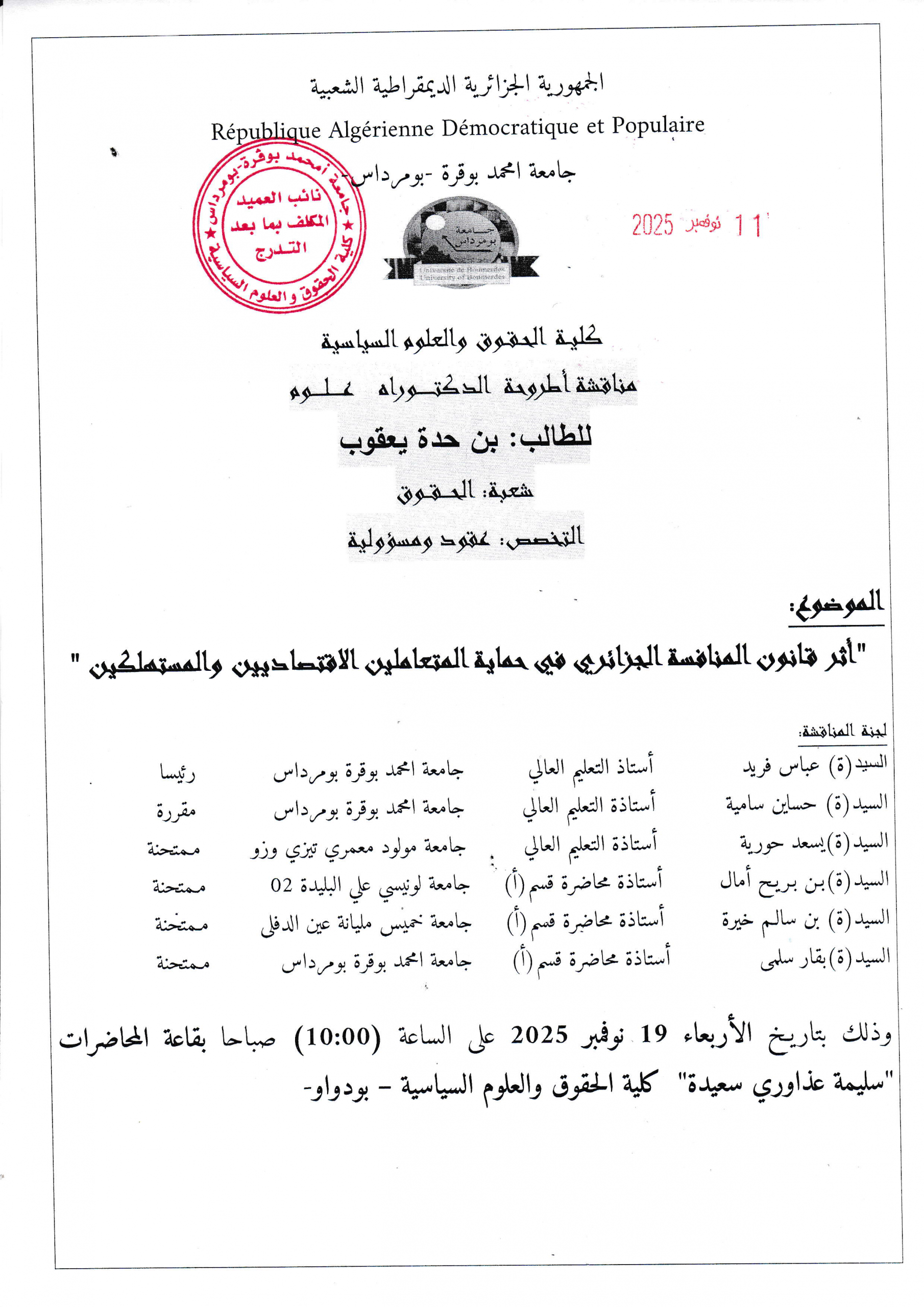 إعلان عن مناقشة الدكتوراه للطلاب بن حدة يعقوب