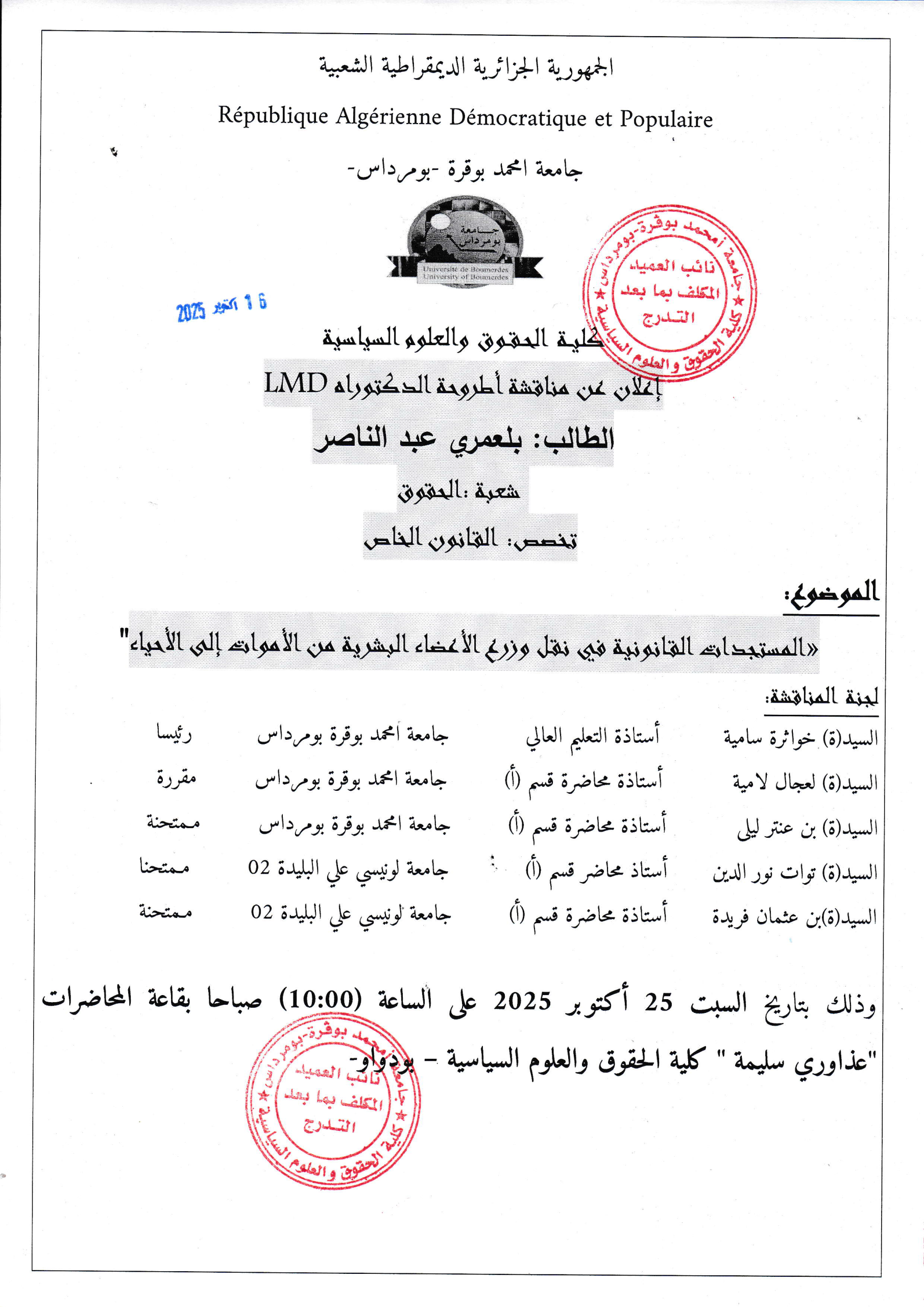 إعلان عن مناقشة أطروحة الدكتوراه للطالب بلعمري عبد الناصر يوم 25 أكتوبر2025