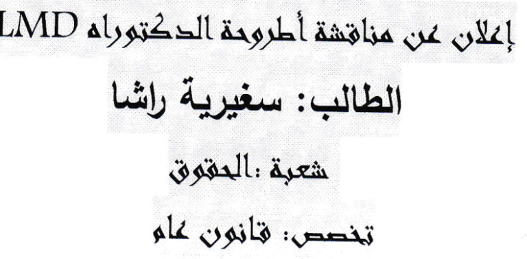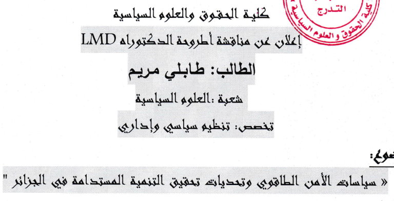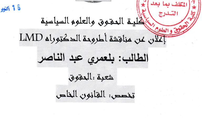 إعلان عن مناقشة أطروحة الدكتوراه للطالب بلعمري عبد الناصر يوم 25 أكتوبر2025